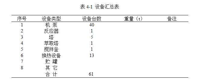 本項(xiàng)目生產(chǎn)裝置工藝設(shè)備共61臺(tái)(套)。各類(lèi)型設(shè)備見(jiàn)設(shè)備匯總表4-1。