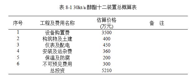 30kt/a醇酯十二裝置總概算見(jiàn)表8-1。